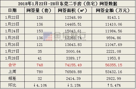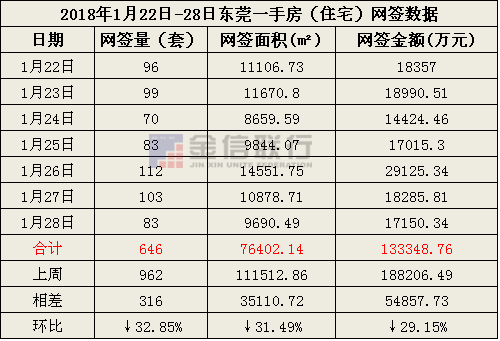 金信联行市场研究部监测数据显示,2018年1月22日—28日,东莞新建商品房住宅网签量646套,环比下降32.85%;网签面积76402.14㎡,环比下降31.49%;网签金额133348.76万元,环比下降29.15%。
